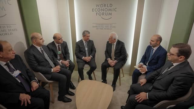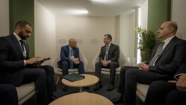 مەسرور بارزانی، سەرۆکوەزیرانی هەرێمی کوردستان لە داڤۆس پێشوازیی لە جاسم محەممەد ئەلبدێوی، ئەمینداری گشتیی...