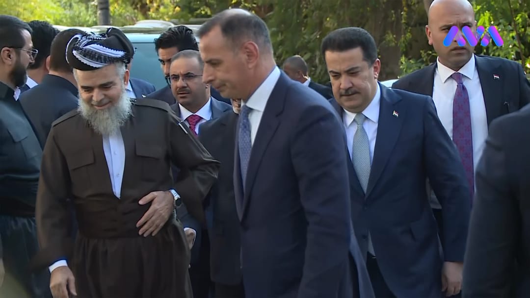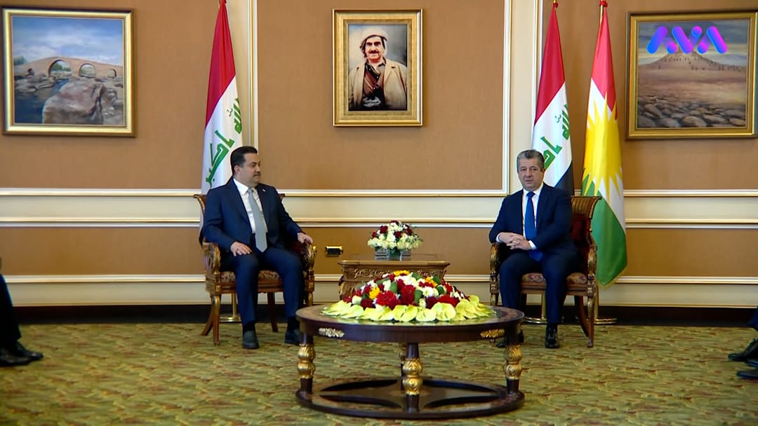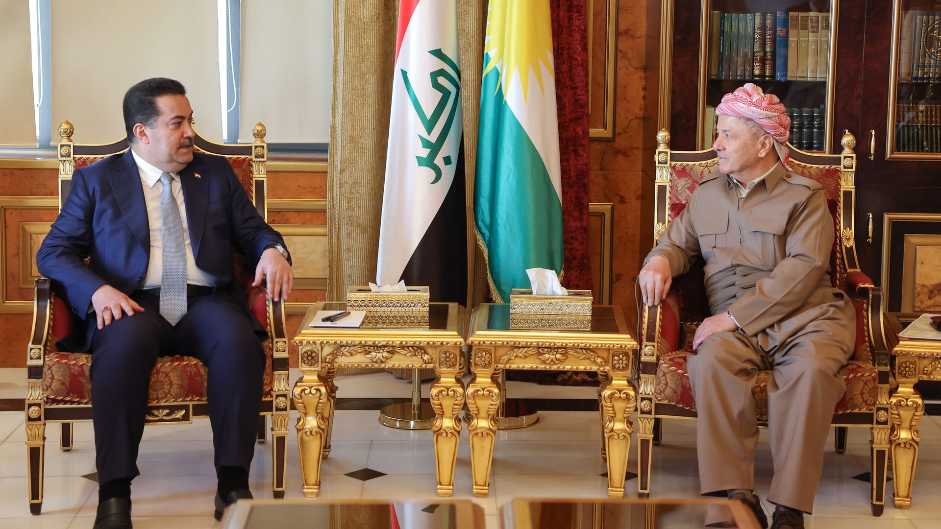 محەممەد شیاع سوودانی دوای دوو کۆبوونەوە لەگەڵ مەسرور بارزانی، سەرۆکوەزیرانی هەرێمی کوردستان و نێچیرڤان بارزانی، سەرۆکی هەرێمی کوردستان لە هەولێر، لەگەڵ سەرۆک مەسعود بازرانی کۆبووەوە
