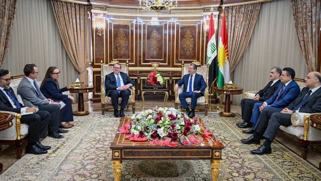 مەسرور بارزانی، سەرۆکی حکومەتی هەرێمی کوردستان، پێشوازی لە جۆشوا هاریس، هەڵسوڕێنەری باڵیۆزخانەی ئەمریکا ل...