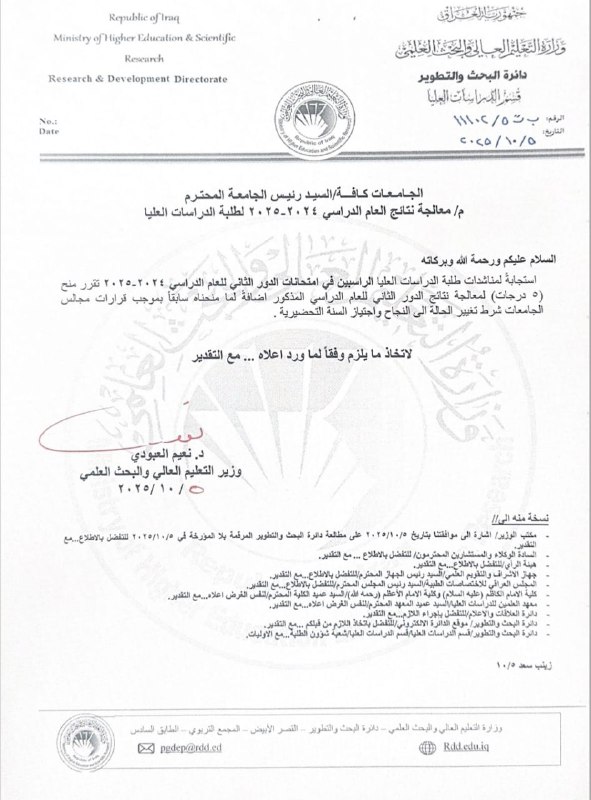 نووسراوی فەرمی: بەگوێرەیی نووسراوێکی وەزارەتی خوێندنی باڵا و توێژینەوەی زانستیی عێراق کە لە ڕێککەوتی 2025-10-05 دەرچووە و واژۆی د. نەعیم عەبودی، وەزیری خوێندنی باڵا و توێژینەوەی زانستی لەسەرە، بڕیاردراوە بە پێدانی 5 نمرە بۆ ئەو قوتابیانەی خوێندنی باڵا کە لە تاقیکردنەوەکانی خوولی دووەمی ساڵی خوێندنی 2024-2025 دەرنەچوون.