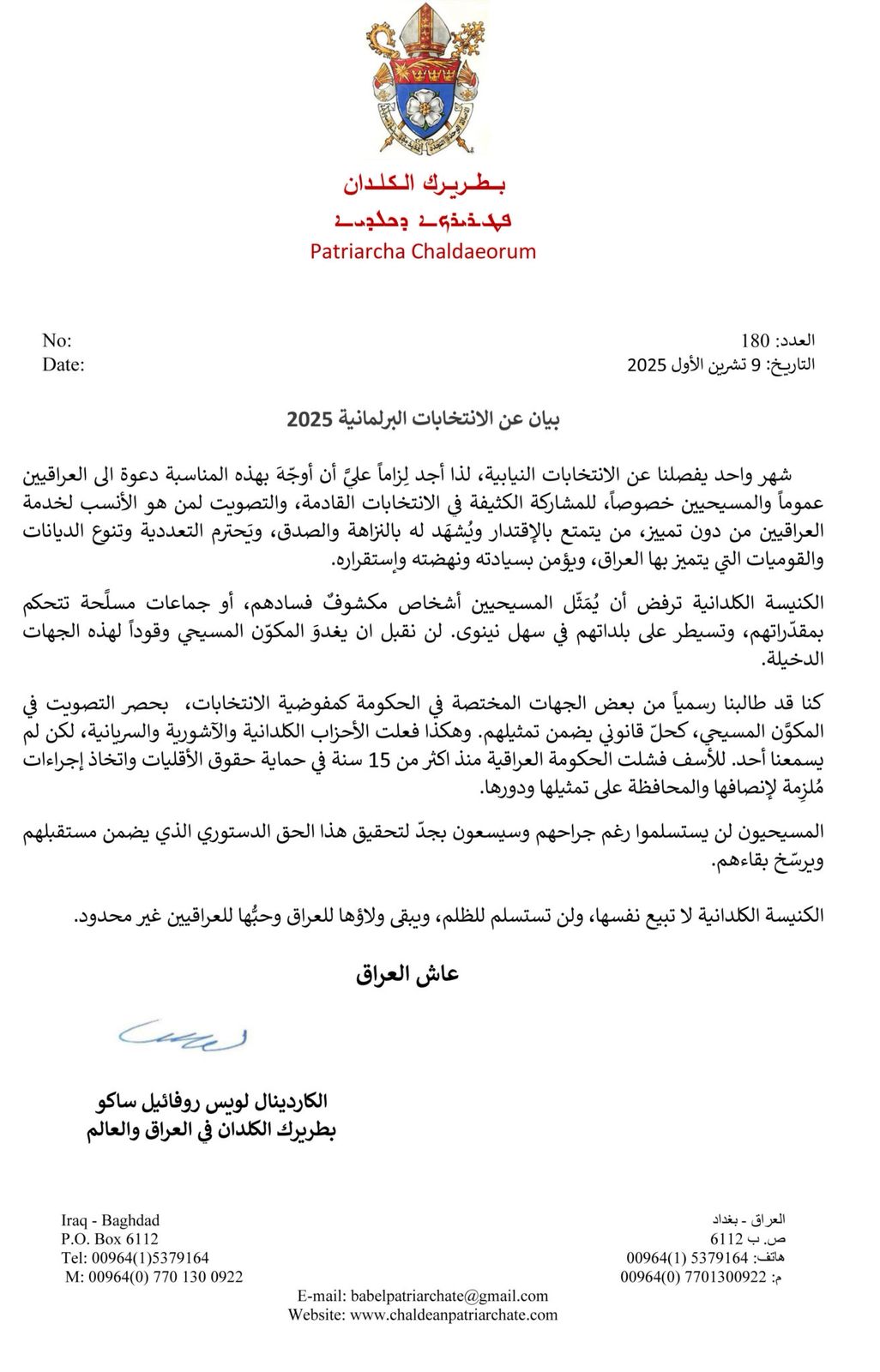 ڕاگەیێنراوی فەرمی: کاردیناڵ لویس ڕافایل ساکۆ، پاتریاکی کلدانەکانی عێراق و جیهان لە پەیامێکدا کە بەبۆنەی نزیکبوونەوەی هەڵبژاردنی پەرلەمانی عێراق بڵاویکردووەتەوە، ئەوەی خستووەتەڕوو، ئەرکە لەسەر هەموو عێراقییەکان بەگشتی و بەتایبەت مەسیحییەکان بە گەرموگوڕییەوە بەشداری لە هەڵبژاردن بکەن و دەنگ بەوانە بدەن کە بەبێ جیاوازی خزمەتی عێراقییەکان دەکەن، دەنگ بەوانە بدەن کە دەستپاک و ڕاستگۆن و ڕێز لە هەمەجۆری ئاینیی و نەتەوەکان دەگرن و باوەڕیان بە سەروەریی، ئاوەدانی و ئارامی وڵات هەیە.