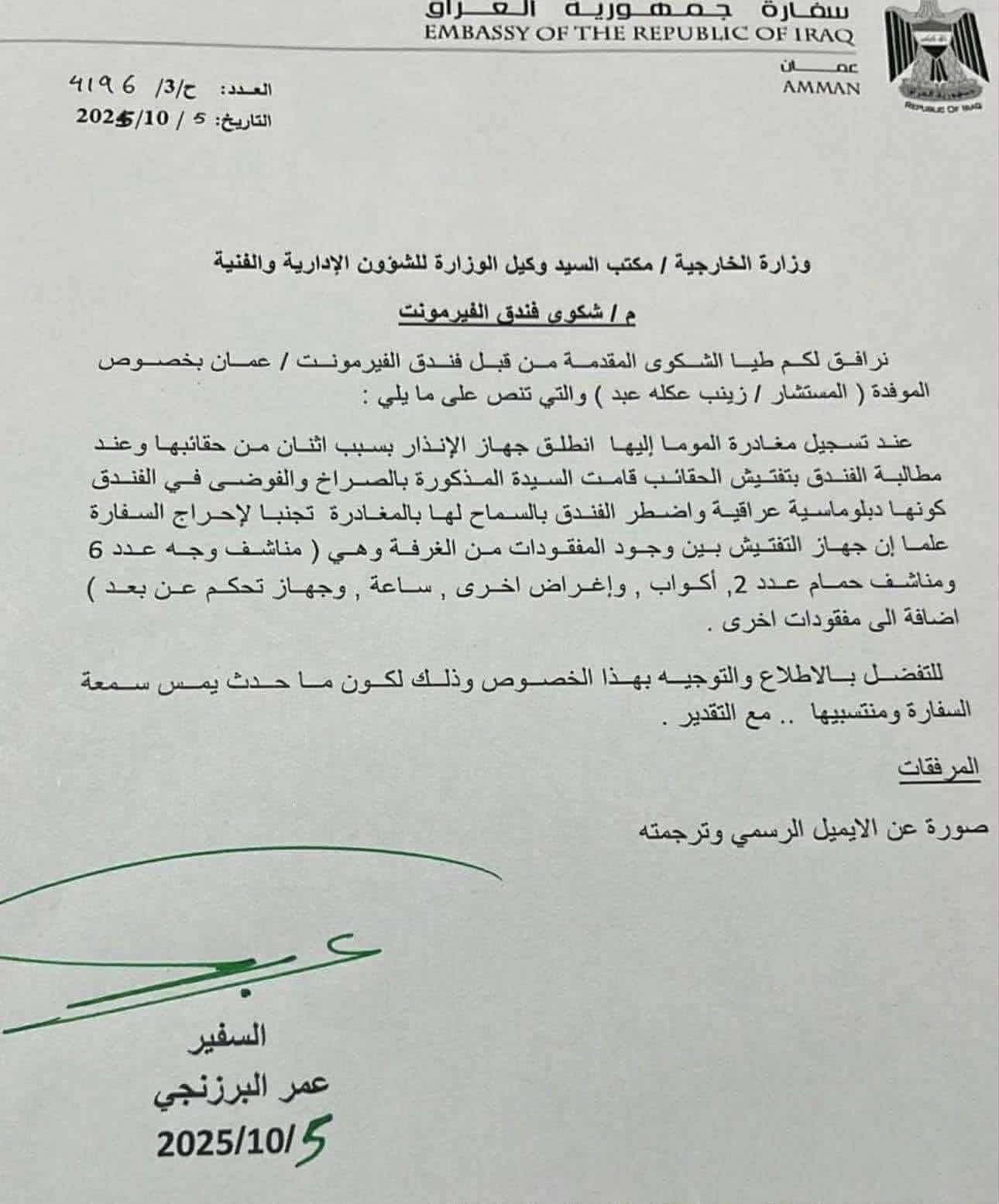 ئەوەی ئێستا ڕوودەدات: هۆتێلی فێرمۆنت عەممان سکاڵایەکی پێشکەش بە باڵیۆزخانەی عێراق لە عەممان کردووە. باڵیۆزخانەی عێراقیش بە نووسراوێکی فەرمی کە واژۆی باڵیۆز عومەر بەرزنجی لەسەرە و لە 5ـی تشرینی یەکەمی 2025 دەرچووە، ئاراستەی نووسینگەی بریکاری وەزارەتی دەرەوە بۆ کاروباری کارگێڕی و هونەری کردووە.