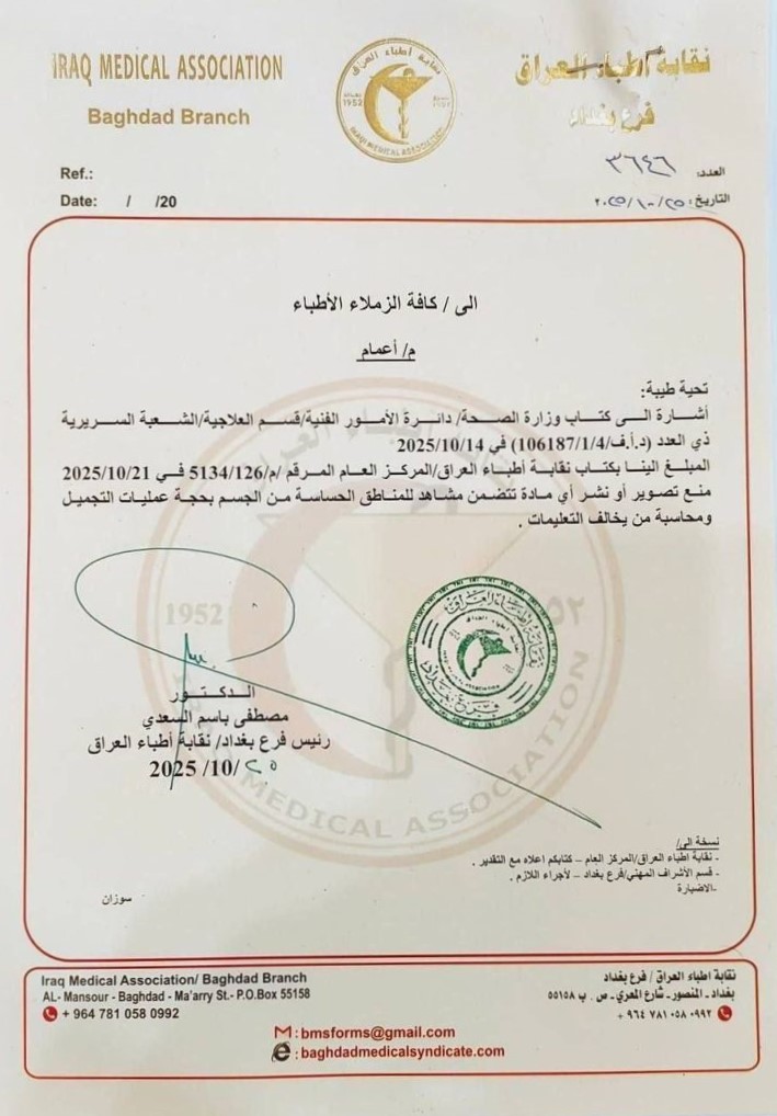 نووسراوی فەرمی: ئەمڕۆ شەممە دکتۆر مستەفا سەعدی، سەرۆکی نووسینگەی بەغدای سەندیکای پزیشکانی عێراق نووسراوێکی ئاراستەی سەرجەم پزیشکانی پارێزگاکە کردووە و تێیدا باسی لەوەکردووە، بە پاساوی نەشتەرگەری جوانکاری، نابێت هیچ وێنە و ڤیدیۆی بابەتێک بڵاوبکرێتەوە کە تێیدا شوێنە هەستیارەکانی جەستە دەردەکەوێت، بەپێچەوانەوە ئەوانەی سەرپێچی دەکەن سزادەدرێن.