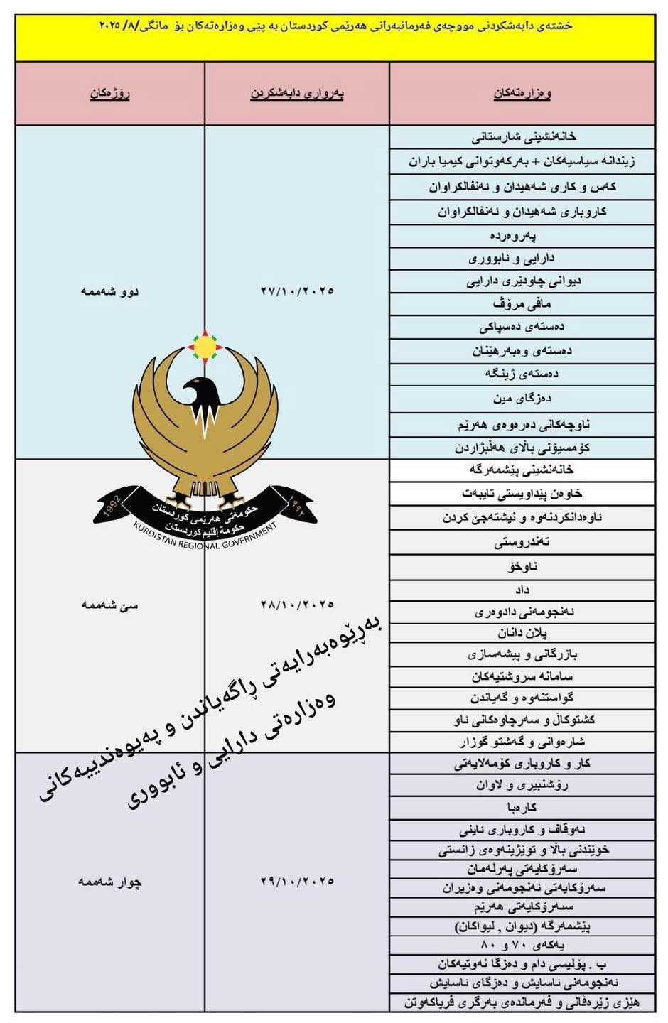 وەزارەتی دارایی و ئابووریی کوردستان خشتەی دابەشکردنی مووچەی مانگی هەشتی بڵاو کردەوە و بە سێ ڕۆژ مووچەی سەرجەم مووچەخۆران دابەش دەکرێت.