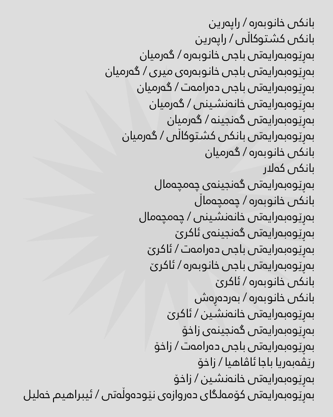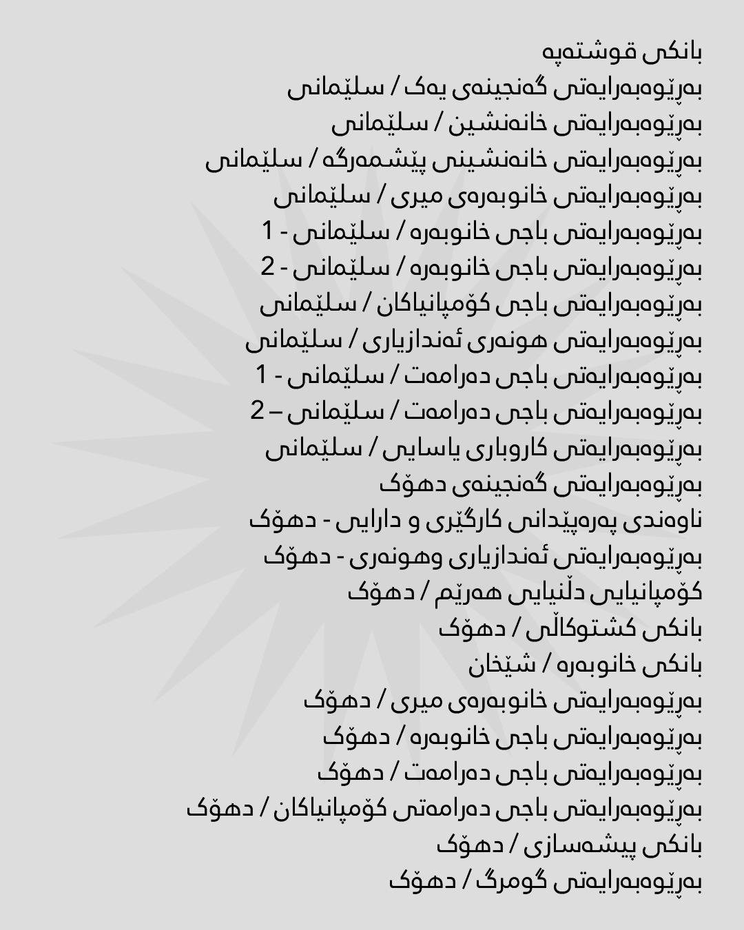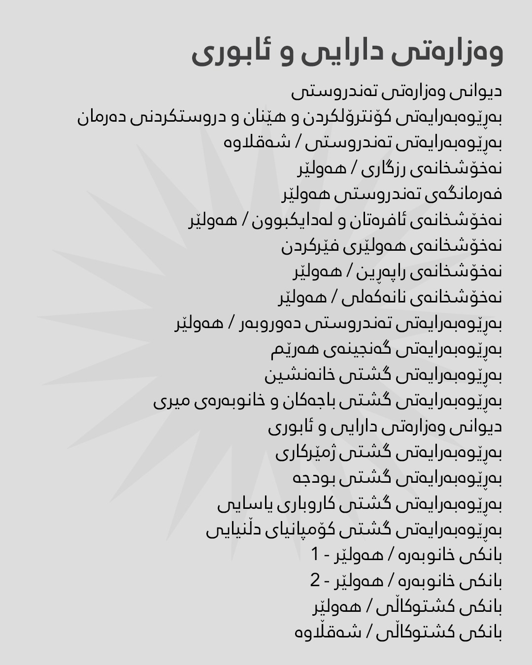 ڕاگەیێنراوی فەرمی: بەگوێرەی لیستەكەی تیمی هەژماری من، هەریەك لە وەزارەتەكانی پەروەردە، دارایی، تەندروستی، شەهیدان و خوێندنی باڵا، مووچەی خانەنشین، دەستەكانی کۆمیسیۆنی هەڵبژاردن، وەبەرهێنان، دیوانی چاودێری دارایی، ژینگە، کاروباری مین، مافی مرۆڤ، دەستپاکی و ناوچە کوردستانییەکانی دەرەوە سبەی دەتوانن مووچەكانیان وەربگرن.