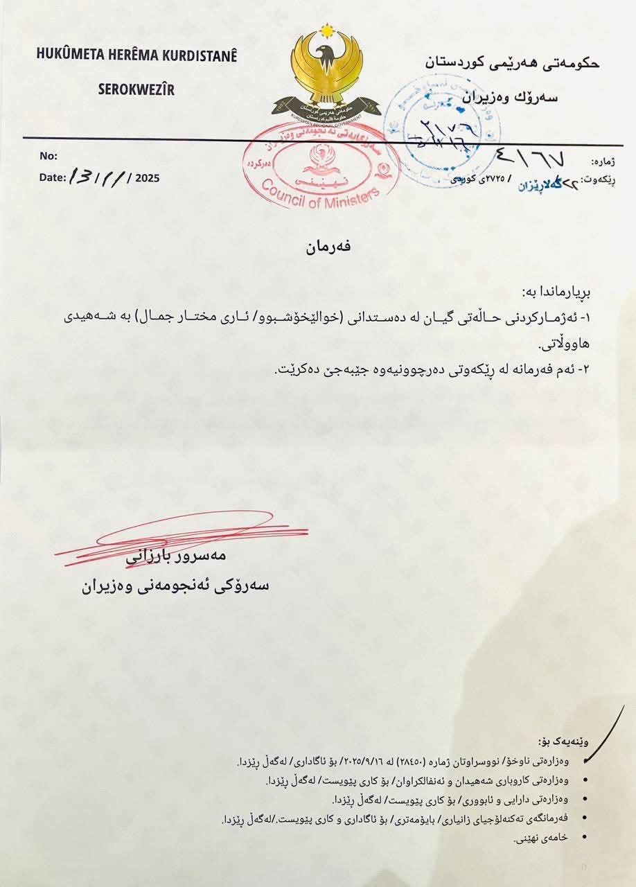 دەقی فەرمانەکە بە واژۆی سەرۆکوەزیرانی کوردستان؛