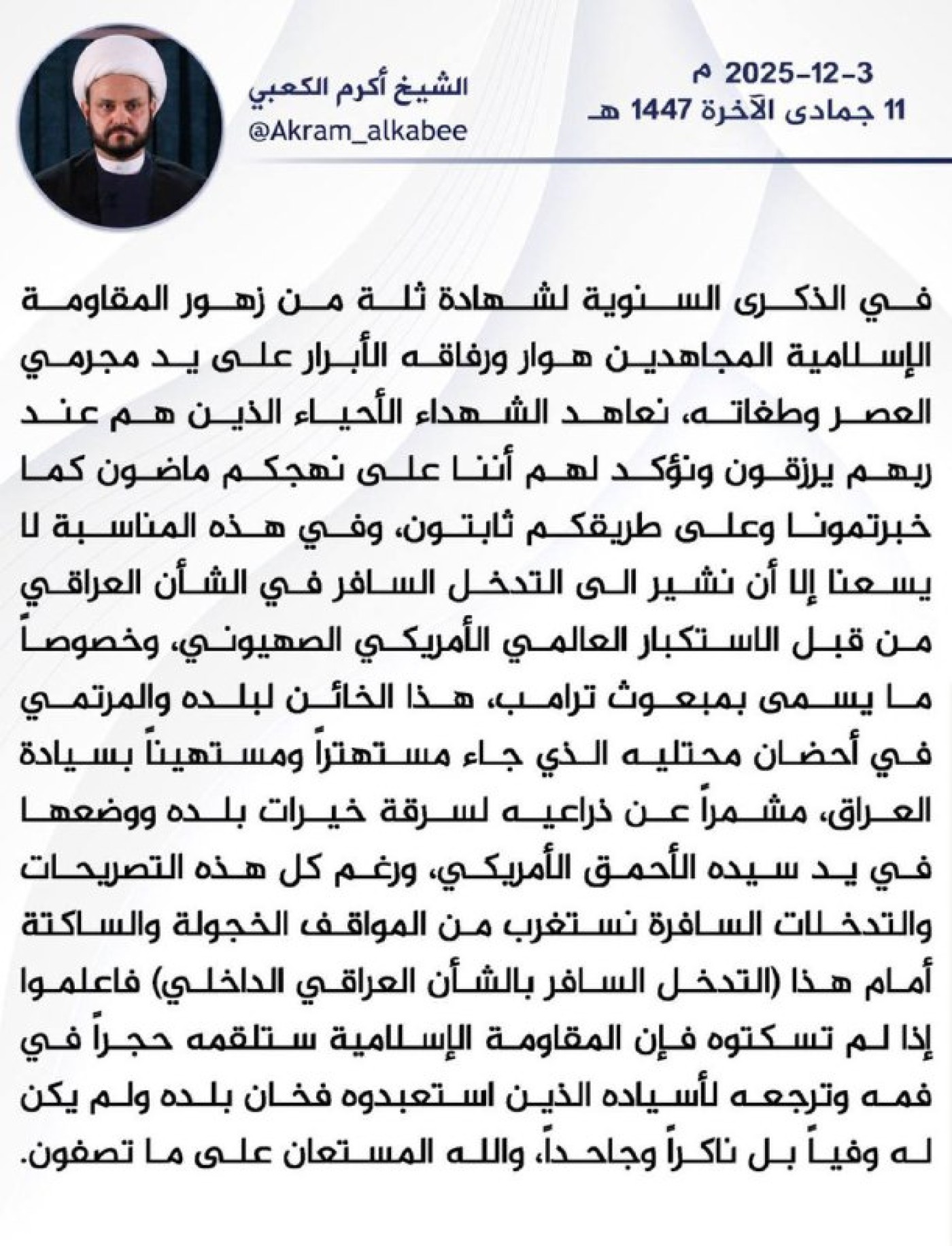 چیرۆکی سەرەکی: ئەمڕۆ چوارشەممە 3ـی 12 2025، کە هاوکاتە لەگەڵ ساڵیادی کوژرانی ژمارەیەک لە چەکدارەکانیان، ئەمینداری گشتیی بزووتنەوەی نوجەبا پەیامێکی تووندی ئاراستەی مارک ساڤایا، نێردەی سەرۆکی ئەمەریکا کرد و وتی، ساڤایا بە شێوەیەکی "بێڕێزانە" مامەڵە لەگەڵ سەروەریی عێراق دەکات و هەوڵی "دزینی خێروبێری وڵات" دەدات بۆ "ئاغا ئەمەریکییە ئەحمەقەکەی".