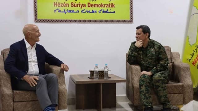 تۆم باراک، نێردەی تایبەتی سەرۆکی ئەمریکا بۆ کاروباری سووریا و مەزڵووم عەبدی، فەرماندەی گشتیی هێزەکانی سوو...